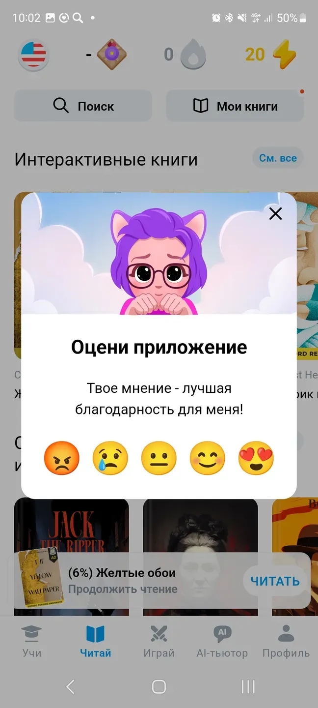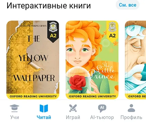 EWA включает в себя тематические подборки с выбором верных ответов, запоминанием слов, чтением книг, занятий с онлайн AI ассистентом для отработки жизненных ситуаций и улучшения навыков